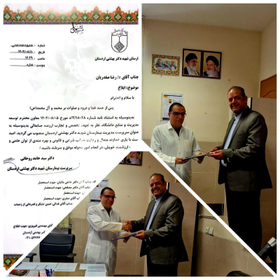 طـی حکـم شماره ۱۵۸۷ به تاریخ ۱۰ آبان ماه ۱۴۰۴، از سوی جناب آقای دکترسیدحامدروحانی ، رئیس محترم بیمارستان شهیددکتربهشتی اردستان ، جناب آقای علیرضاصفدریان به عنـوان مدیربیمارستان شهیددکتربهشتی اردستان منصـوب گردید.