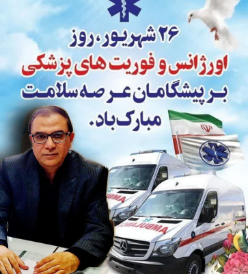 اینجانب فرارسیدن 26 شهریور ماه و روز اورژانس را به تمامی همکاران سفید پوش و خستگی ناپذیر در مجموعه اورژانس شهرستان اردستان تبریک عرض نموده و سلامتی شما عزیزان را از خداوند منان خواستارم.