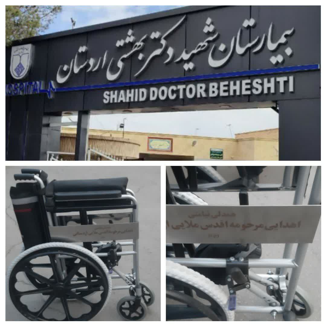 در اقدامی خداپسندانه و مهرورزانه خانواده محترم مرحومه#اقدسملاییاردستانی که با خرید یک دستگاه ویلچر (صندلی حمل بیمار) به مبلغ بالغ بر ۶۰ میلیون ریال معادل شش میلیون تومان خریداری، به بیمارستان شهیددکتربهشتی اردستان اهدا نمودند.