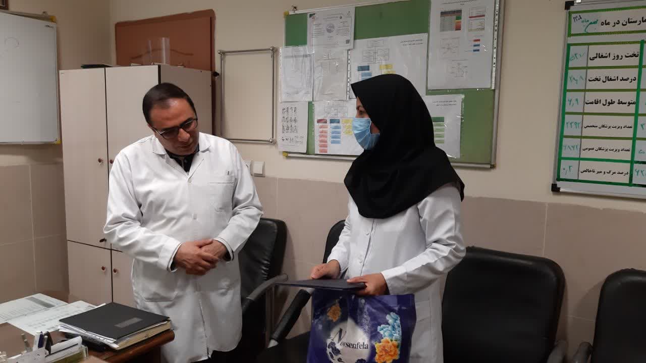 🔹️ تقدیرو تشکراززحمات کارشناس تغذیه بیمارستان سرکار خانم یزدانی بمناسبت روزجهانی رژیم درمان گر، مورخ ۱۶ اسفند ماه، توسط ریاست بیمارستان جناب اقای دکترسیدحامدروحانی و مدیریت محترم بیمارستان جناب اقای نادمی باتقدیم هدیه و لوح تقدیرانجام شد.