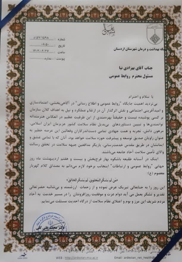 🌕تقدیر از مسئول روابط عمومی بیمارستان شهیددکتربهشتی اردستان با اهدای لوح سپاس