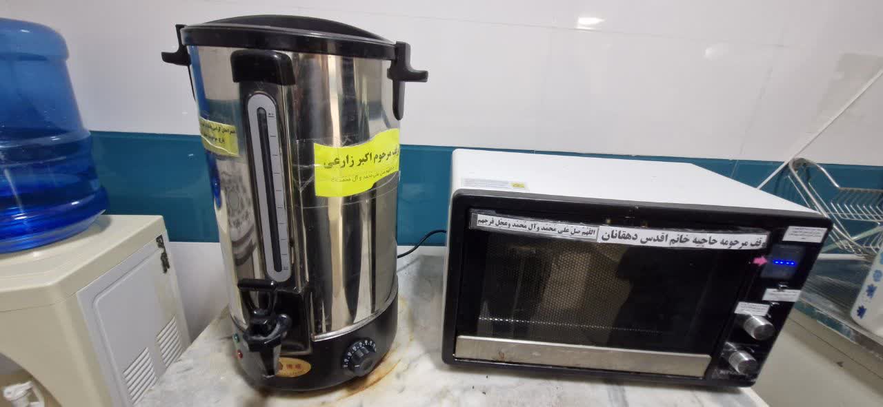 2) سماور برقی ۲۰ لیتری توسط خانواده مرحوم اکبر زارعی به مبلغ ۱۲۵/۰۰۰/۰۰۰ یکصدو بیست و پنج میلیون ریال خریداری و به بیمارستان اهدا نمودند.
